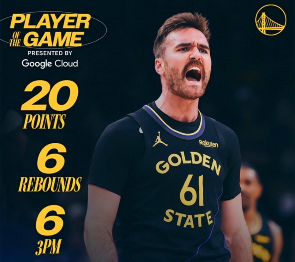 首先是包括斯潘塞在内的一众奇兵提供了可观的三分火力,全场斯潘塞11中6,三分10中6独揽20分6板4助2抢断全能数据,赛后被勇士队评选为全场最佳。